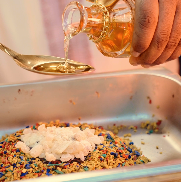 Ce parfum évoque les moments de spiritualité et de sérénité, où la fumée du louban (encens) s’élève lentement, purifiant l’air et apaisant l’âme.